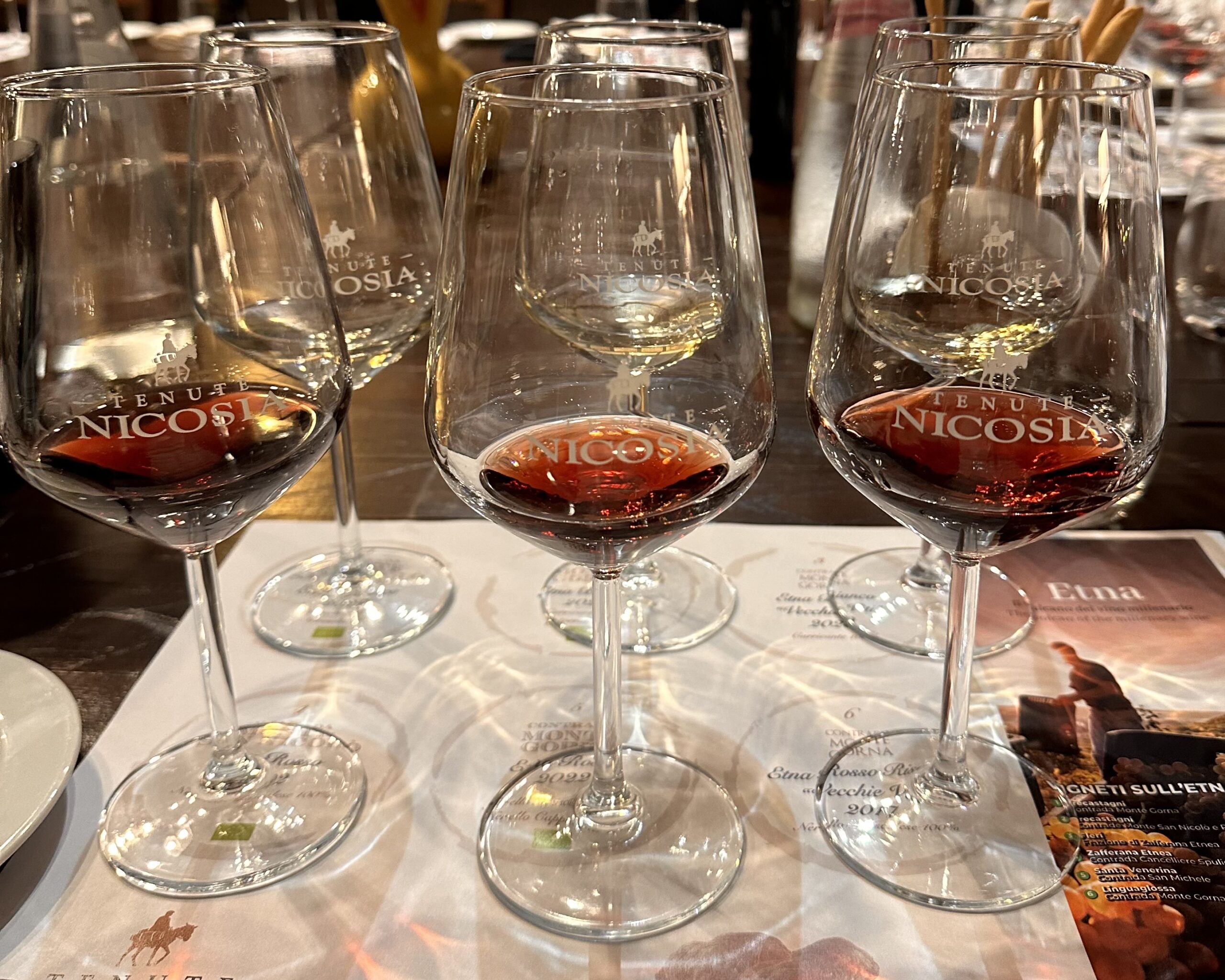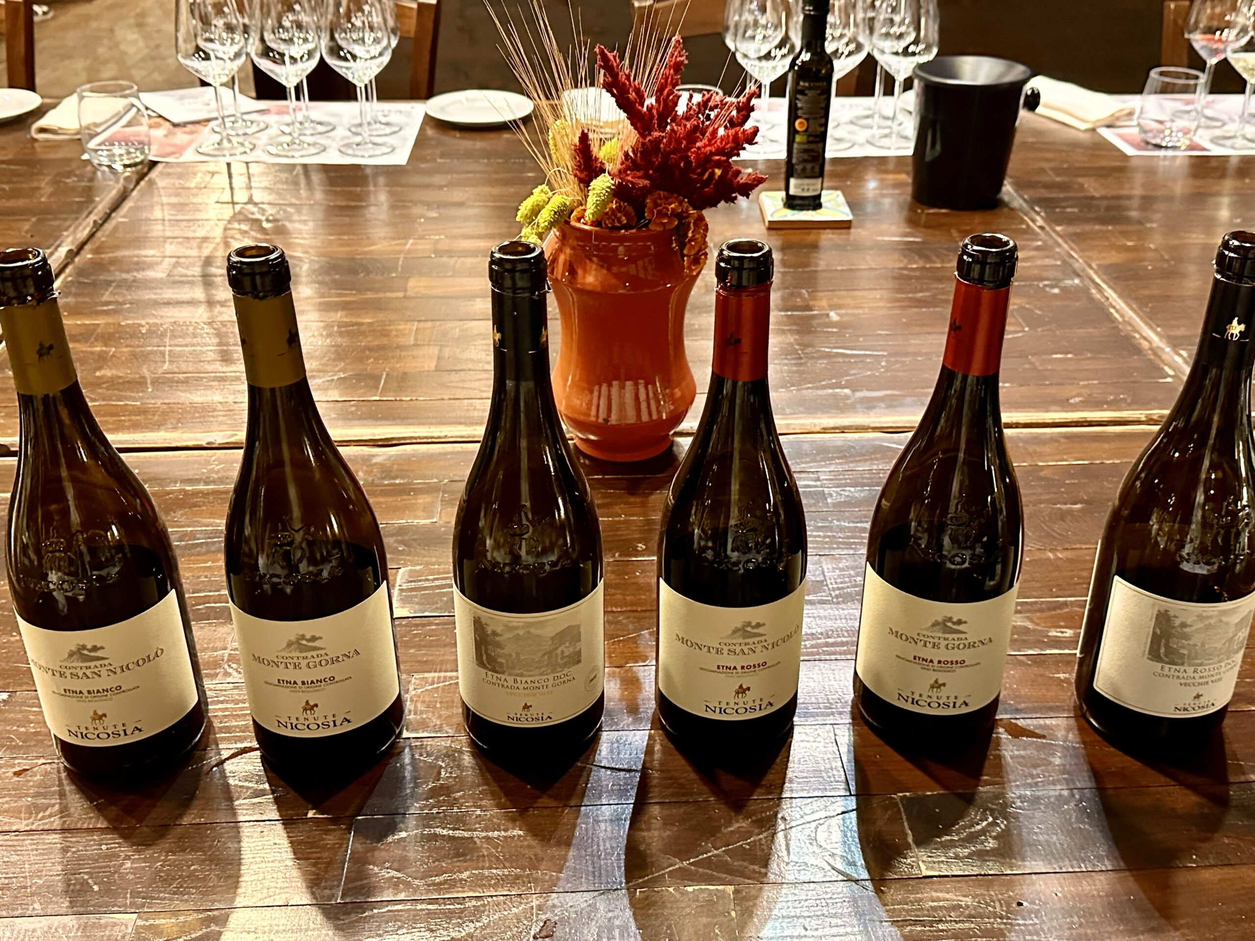 La prima tappa è dedicata alla linea Contrade dell’Etna. I bianchi, dominati dal Carricante, si distinguono per profumi agrumati e floreali, una freschezza tagliente e una spiccata mineralità. I rossi, centrati sul Nerello Mascalese, mostrano frutto nitido, note speziate e tannini setosi: vini puliti, precisi, che esprimono con immediatezza il carattere vulcanico.