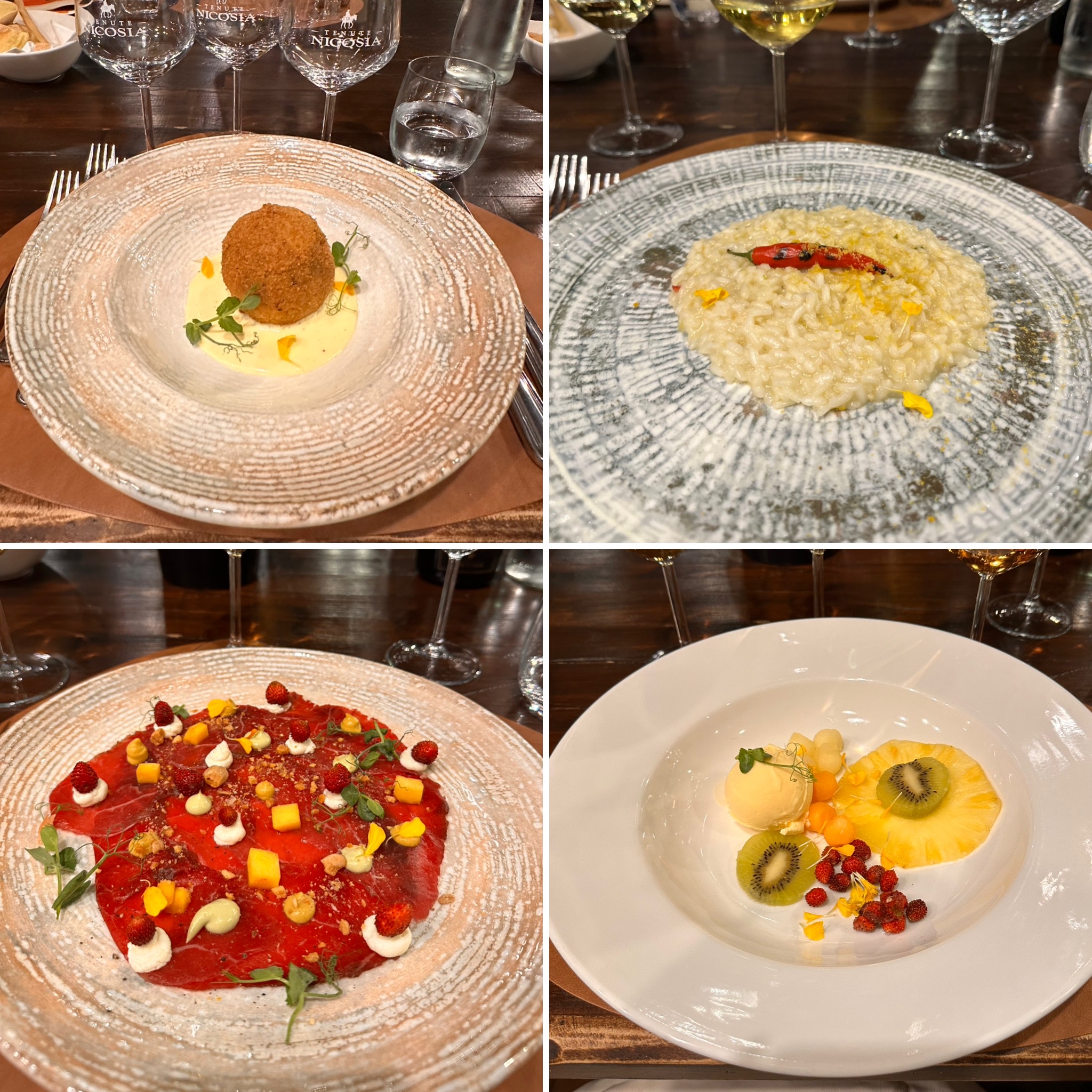 All’Osteria, il menu crea un equilibrio naturale tra territorio e bicchiere: ingredienti locali, alcuni presidio Slow Food, cotture delicate e erbe spontanee dell’Etna, in una cucina che rispecchia la filosofia della cantina – autenticità, eleganza sobria e rispetto per il luogo. Il risultato è un racconto coerente, che si manifesta tanto nel piatto quanto nel vino.