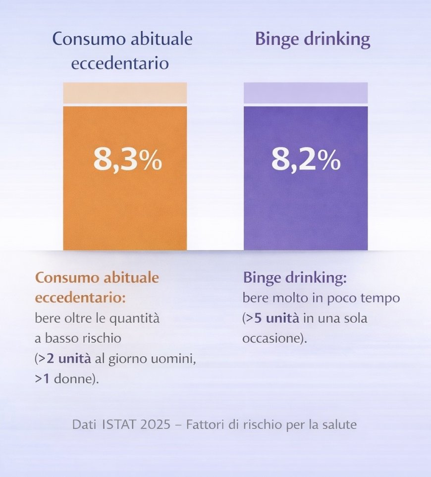 A cambiare non sarebbero quindi i livelli complessivi, quanto piuttosto le forme di consumo: si registrerebbe una diminuzione del consumo quotidiano oltre le soglie raccomandate, accompagnata da un aumento di modalità più episodiche e concentrate.