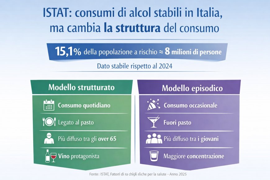 Nel 2025 il consumo di alcol in Italia si manterrebbe complessivamente stabile nei valori, ma mostrerebbe una trasformazione nelle modalità di assunzione.