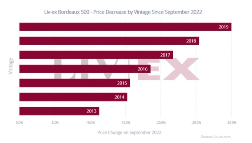 Bordeaux per annata: le annate più recenti risultano più esposte alla fase di correzione, mentre i millesimi precedenti mostrano una tenuta relativa maggiore.