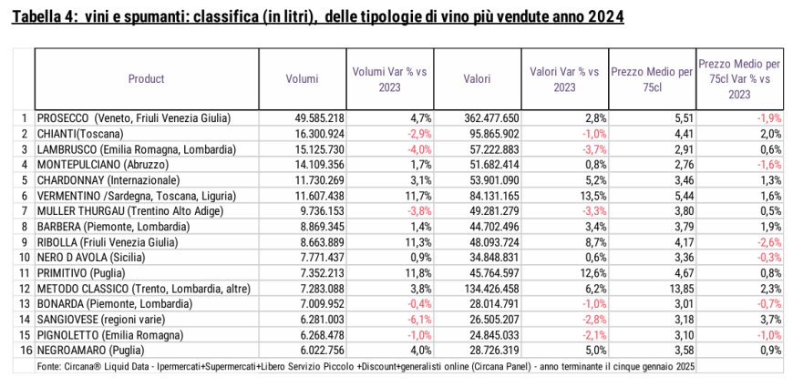 La grande distribuzione organizzata in Italia ha commercializzato 753 milioni di litri tra vini e spumanti nell’anno 2024, generando un fatturato totale di 3,2 miliardi di euro. Si è riscontrata una flessione dei volumi pari allo 0,7% confrontando con il 2023, una contrazione comunque meno significativa rispetto al precedente anno (-2,2%). Va evidenziato inoltre che il comparto ha manifestato un incremento sul piano economico, con un andamento positivo del 2,3% a valore.RiprovaClaude può commettere errori. Verifica sempre le risposte con attenzione.