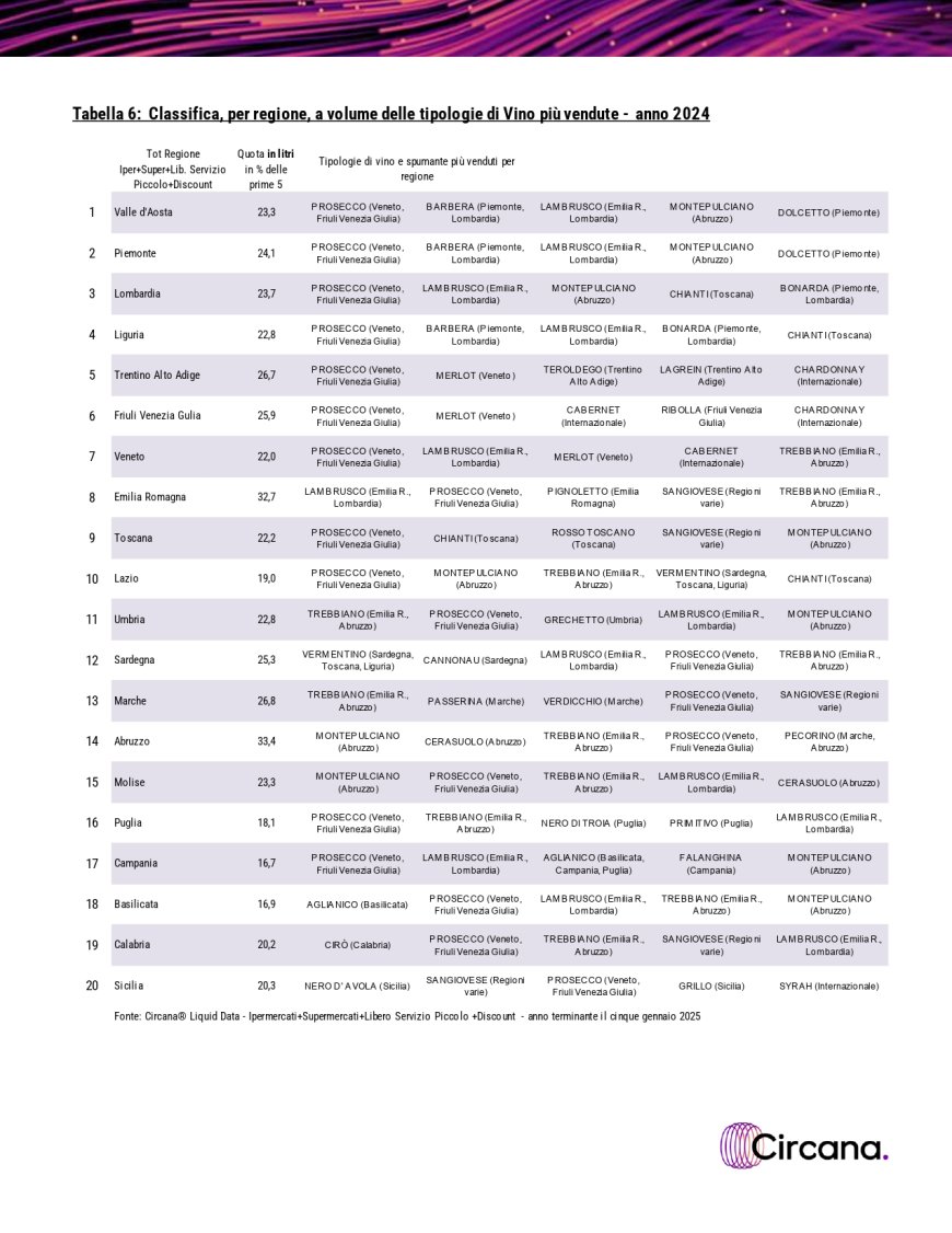 Interessante il dato ricavato dall’analisi del contributo delle aziende della Grande Distribuzione al risultato del 2024: sono le prime 25 aziende per fatturato ad aver contribuito maggiormente in positivo alle vendite di vino, grazie ad un aumento del 1,3% della pressione promozionale cui ha corrisposto una crescita del +0,6% a volume (+3,2% a valore).