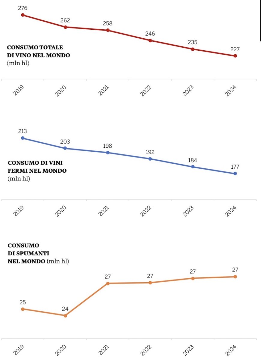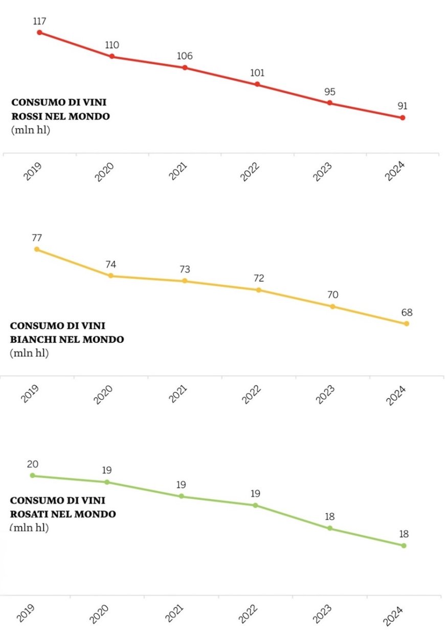 La situazione non riguarda esclusivamente l’Italia. Le informazioni raccolte dall’Osservatorio del Vino UIV nel rapporto Vino in Cifre indicano che il consumo mondiale è passato da 276 milioni di ettolitri nel 2019 a circa 227 milioni nel 2024, evidenziando una riduzione significativa soprattutto nei mercati maturi.