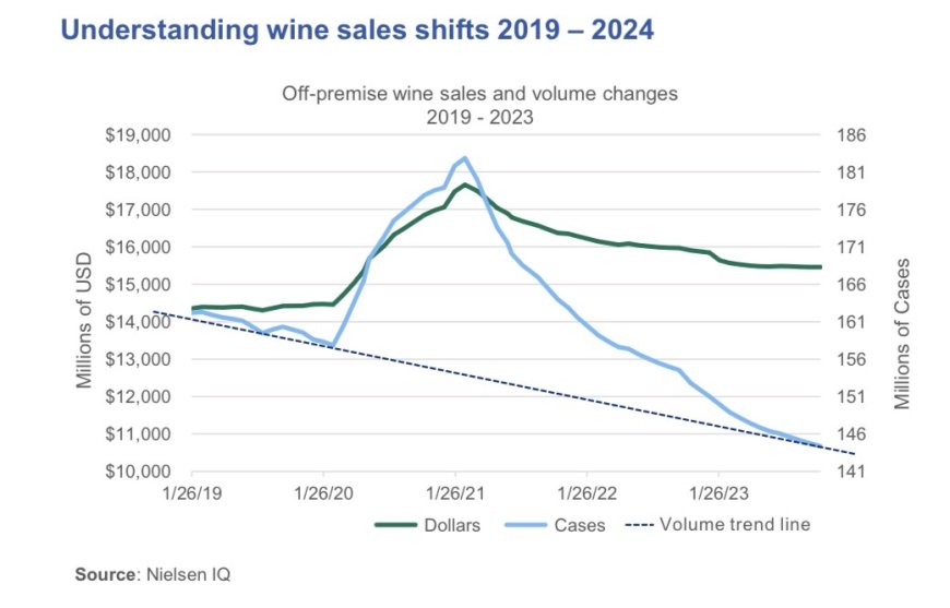 Andamento delle vendite di vino nel mercato statunitense (off-premise). Fonte: Silicon Valley Bank – State of the U.S. Wine Industry 2026, dati NielsenIQ.